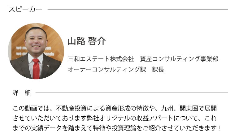 三和エステート株式会社(本社:福岡市博多区博多駅南、代表取締役社⻑:⽯井 清悟、以下「三和エステート」)は、この度2024年12月14日(土)にオンラインにて開催される日本最大級の資産運用イベント『資産運用EXPO』に登壇することをお知らせいたします。